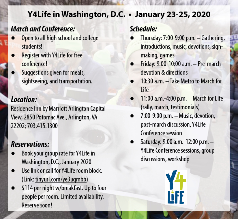 But that’s not all! Youth who stay in our hotel block at the Residence Inn Arlington Capital View are also invited to attend a FREE Y4Life Conference the same weekend! Join us before the march on Thursday, January 23, for an evening of devotions, sign-making, and opportunities to get to know other 4Life youth. Then attend our conference Friday evening and Saturday morning to explore other 4Life issues.