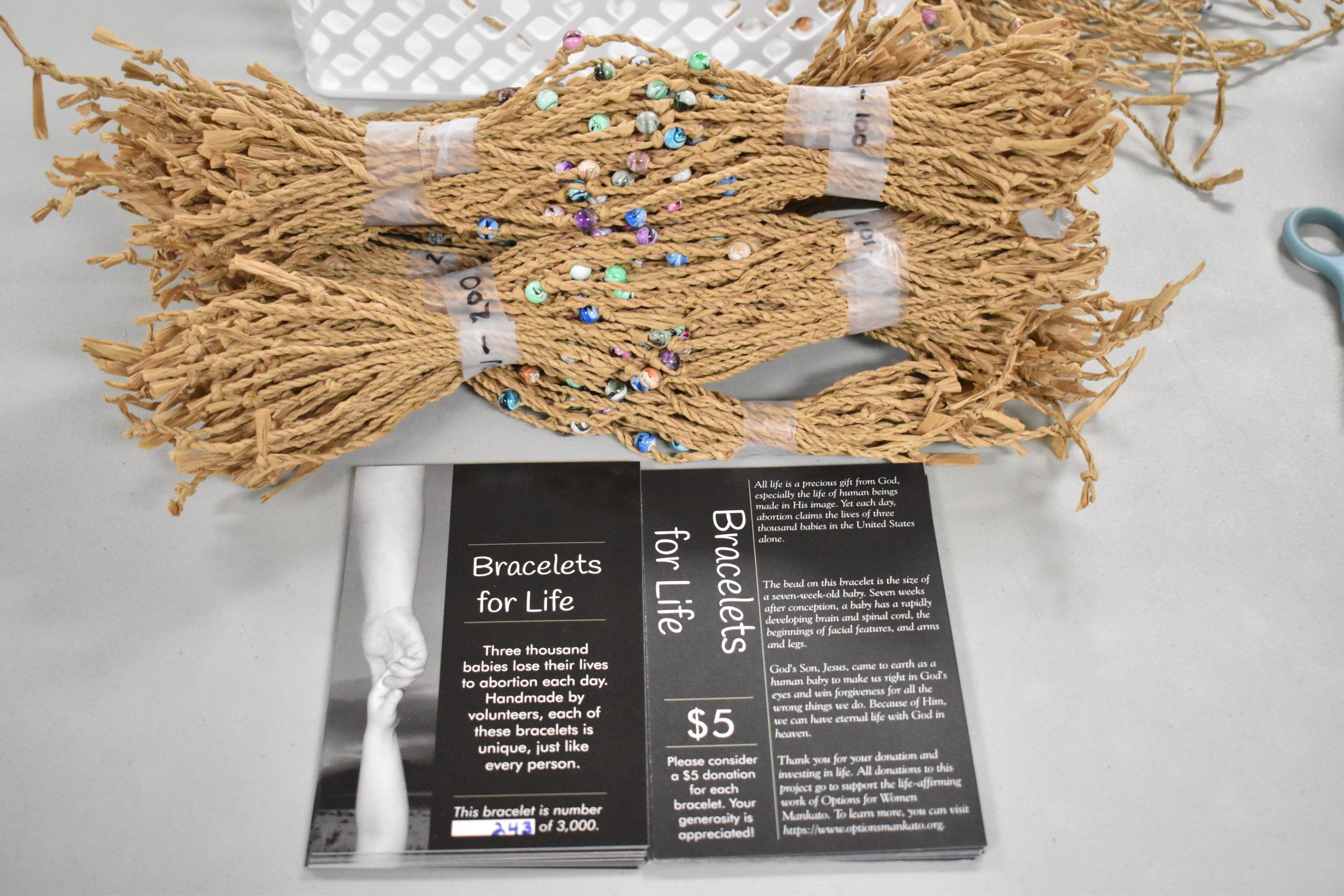 There is a lot that I hope to accomplish with this project. One of my main goals is simply to create more awareness about the magnitude of abortion. While people may have heard the statistic that three thousand babies are aborted each day, they might not realize what a huge number that actually is. (I didn’t until I started making that many bracelets by hand!) The bracelets are distributed with postcards that explain this project and request a donation to our local prolife clinic. These postcards are numbered 1 to 3,000, making this number more personal to the people who receive these bracelets.